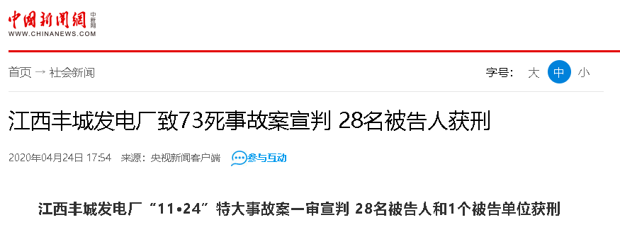 2020年4月24日,江西省宜春市中级人民法院和丰城市人民法院、奉新县人民法院、靖安县人民法院对江西丰城发电厂“11·24”冷却塔施工平台坍塌特大事故所涉9件刑事案件进行了公开宣判,对28名被告人和1个被告单位依法判处刑罚。